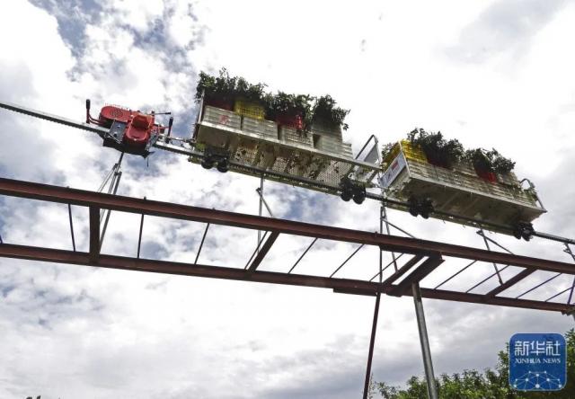 6月27日,在四川达州高新区幺塘乡后河村,无人驾驶“智能小火车”满载花椒通过轨道桥。