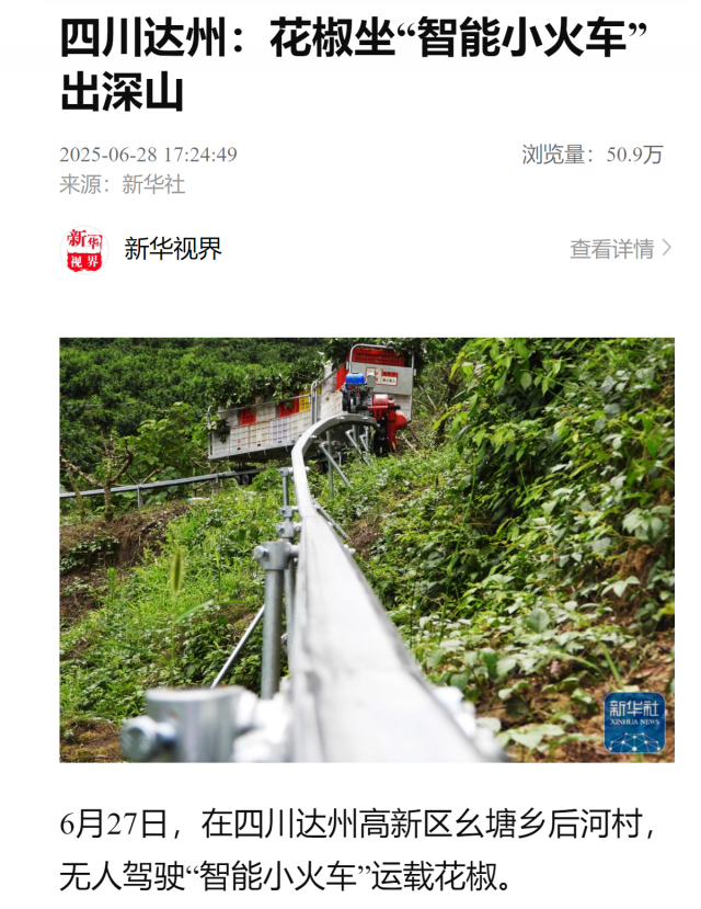 连日来,新华社、《四川日报》关注达州高新区幺塘乡后河村无人驾驶“智能小火车”运载花椒。