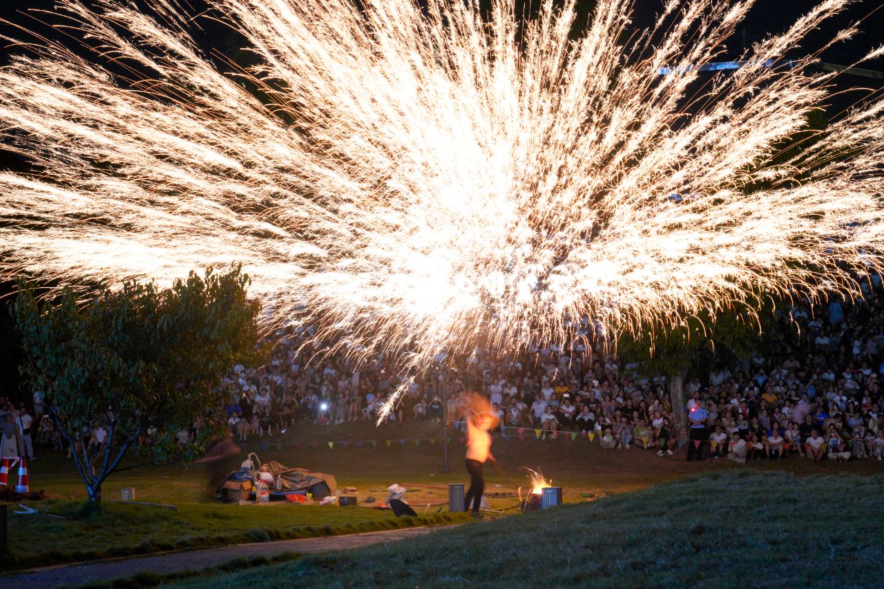 夜幕降临,梨树坪的非遗展演率先点燃现场氛围。川剧变脸表演中,表演者随密集鼓点翻飞衣袂,转身间脸谱瞬时变换,引得台下观众阵阵惊呼;火壶舞者以高温火焰为“笔”、深邃夜空为“卷”,挥洒出一幅幅灵动的光影图腾;最受瞩目的打铁花表演,将1600摄氏度的铁水抛向空中击打,金黄璀璨的铁花如星辰坠落,让市民沉浸式感受千年非遗的浪漫与震撼。“小时候过年才见得到打铁花,今天一看,满是童年回忆,太震撼了!”市民程久兰难掩激动。