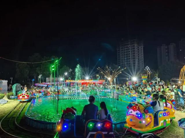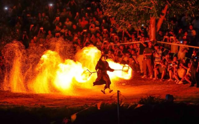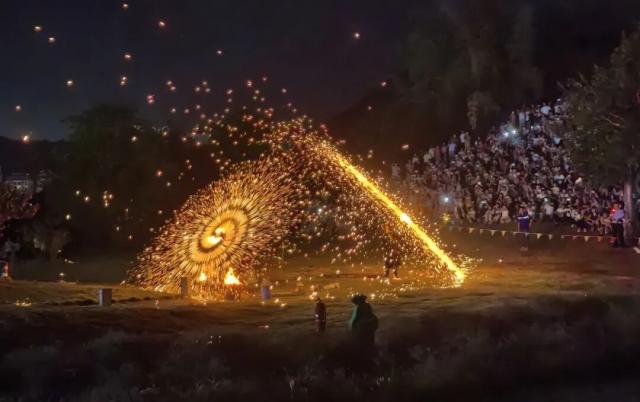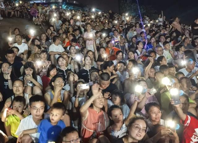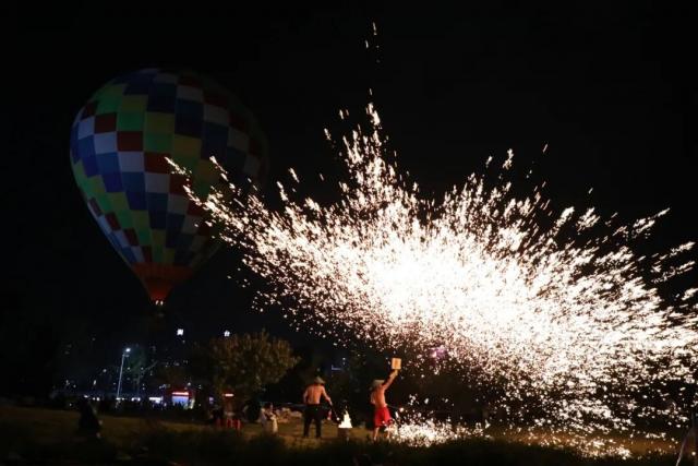 夜幕下的梨树坪湿地公园灯火璀璨,非遗展演区成为全场焦点。每晚,川剧变脸演员在密集鼓点中衣袂翻飞,脸谱瞬息万变;火壶舞者以1600℃铁水为“墨”,在夜空中泼洒出“火树银花”;最震撼的打铁花表演中,匠人将滚烫铁水抛向高空击打,金黄铁花如流星坠落,引得观众阵阵惊叹。七夕当晚,猜灯谜、情歌大合唱、浪漫打卡点等,定格幸福美丽瞬间。