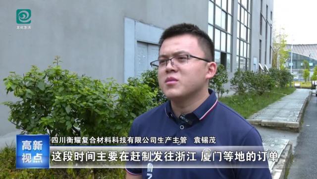 四川衡耀复合材料科技有限公司生产主管袁锡茂:目前,公司的订单量十分饱和,这段时间主要在赶制发往浙江、厦门等地的订单,为了按时完成订单交付,我们采取了多项措施,优化生产流程,提高生产效率,力争国庆假期之前将当前订单按时、高质量地送到客户手中。