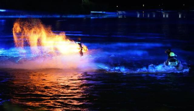 19时许,《歌唱祖国》《没有共产党就没有新中国》《我和我的祖国》的激昂旋律在公园上空回荡,万人合唱声振云霄。随后,精彩的非遗“火壶”水上表演将现场气氛推向首个高潮。