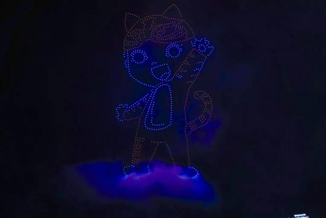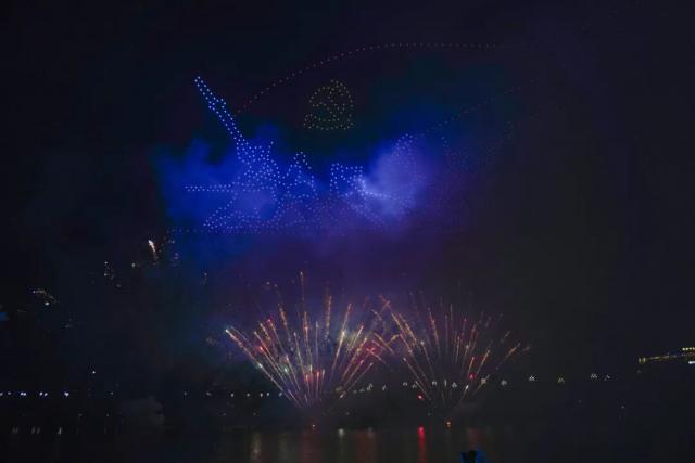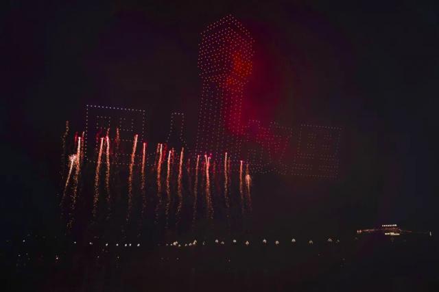 千架无人机列阵腾空,与多维立体焰火在夜空中翩然共舞,以科技融合艺术的光影语言瞬间点燃全场热情,整场演出以“古今对话”为轴线,借“科技美学”为叙事笔法层层掀起情感浪潮。
