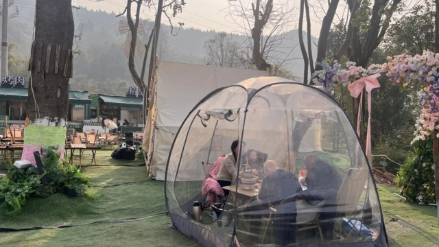 步入基地,透明帐篷如星点散落湖畔。游客们围炉煮茶,孩童在旁嬉戏玩耍,勾勒出一幅温馨的冬日休闲图景。为提升体验,营地配备齐全的水电设施,并提供餐饮、烧烤等一站式服务,让露营轻松便捷。