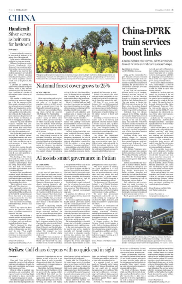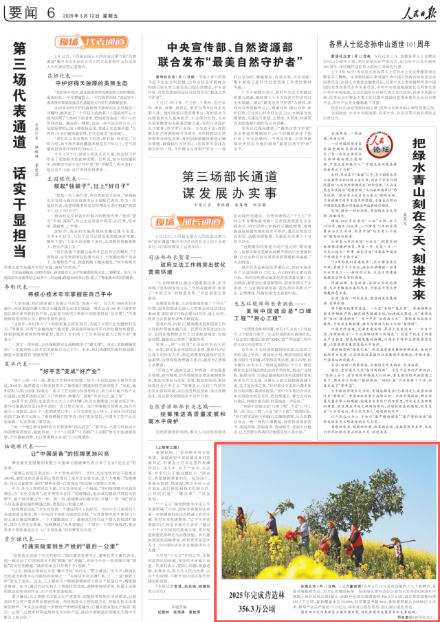 3月13日出版的《人民日报》第6版和《中国日报》第5版,报道关注达州高新区幺塘乡镇口村村民和党员志愿者参加义务植树活动。
