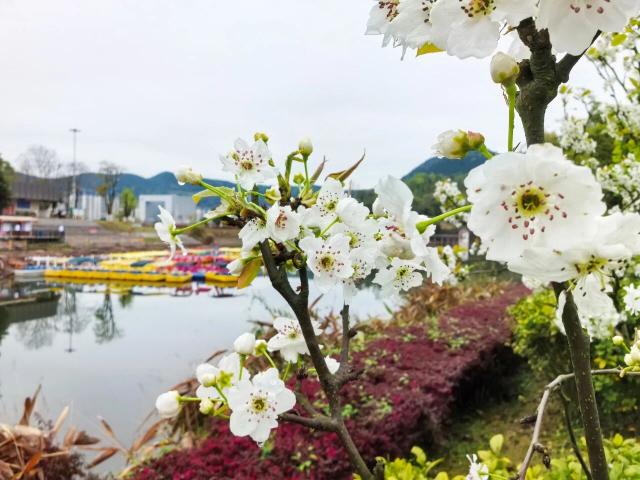 经过一场春雨的洗礼,公园内的梨花更加明艳。在湖畔两岸,梨树层层叠叠,枝头挂满了洁白如雪的梨花。有的花朵独自绽放,宛如优雅的仙子,在微风中轻轻摇曳;有的则簇拥在一起,形成了一团团、一簇簇的花球,散发着淡淡的清香。 从远处望去,洁白的梨花与翠绿的枝叶相互映衬,构成一幅清新雅致的春日画卷。