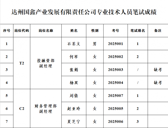根据《2025年公开选聘达州国鑫产业发展有限责任公司专业技术人员公告》规定和工作安排,现将笔试成绩公示如下。