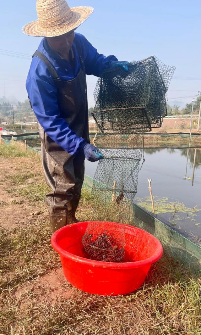 清晨,石板街道关渡村四合坨小龙虾养殖基地水雾氤氲,养殖负责人陈明勇身着防水衣裤,推着小船在虾田间缓缓行进。他熟练地将虾笼从木桩上解下,随着一提一拉的动作,一只只色泽鲜亮、活力十足的小龙虾纷纷滚落红色大盆。