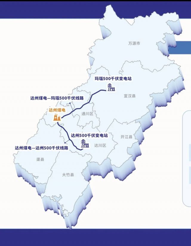 达州辖区内现有达州500千伏变电站、玛瑙500千伏变电站这两座500千伏变电站。达州煤电500千伏送出工程总投资4.5亿元,建设内容主要是变电工程、线路工程。其中,变电工程包括扩建达州500千伏变电站出线间隔1个、扩建玛瑙500千伏变电站出线间隔1个;线路工程包括新建达州煤电-达州500千伏线路40公里、新建达州煤电-玛瑙500千伏线路63公里,线路途经达川区、通川区、达州高新区、宣汉县、渠县等地。