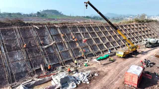 据四川交通建设集团有限公司联网路项目工区长肖磊介绍,目前正在进行锚杆框架梁混凝土浇筑,现已经完成15%,土石方工程也已完成75%,桩基工程完成首桩浇筑,完成整个工程量的23%,为后续桥梁主体结构及边坡防护等施工提供了扎实基础。
