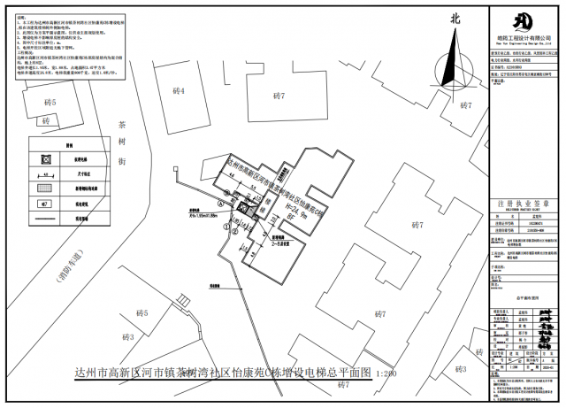 该图为达州高新区河市镇茶树湾社区怡康苑C栋增设电梯设计方案的总平面图,该项目位于河市镇茶树湾社区怡康苑C栋。该项目规划设计方案已通过达州高新区国土空间规划和自然资源管理委员会2026年第1次专委会审查。