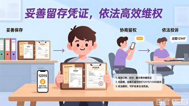 消费全过程请妥善保存商品宣传页面、订单信息、支付记录、聊天截图、物流单据、发票或购物凭证等关键材料。发生消费纠纷时,第一时间与商家、平台客服沟通协商;协商不成,可及时拨打12315、12345热线,或通过全国12315平台、APP、小程序进行投诉举报,依法维护自身合法权益。