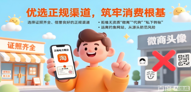 请选择证照齐全、信誉良好、售后完善的正规电商平台、品牌官方旗舰店、自营店铺进行消费。下单前主动核验商家营业执照、行政许可、信用评价等信息,不轻信无资质“微商”“代购”“私域交易”。不点击陌生链接、不扫描可疑二维码、不进行私下转账交易,远离钓鱼网站、虚假店铺,从源头防范消费风险。