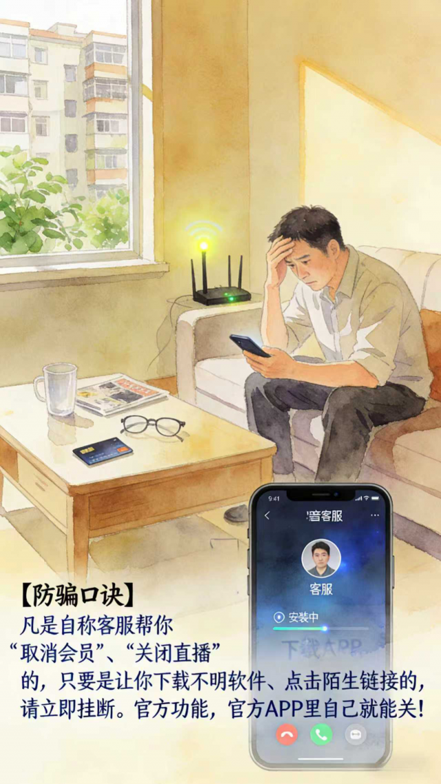 我市居民王某接到一通“某音官方客服”电话。对方称其开通了直播功能,如不关闭每月将自动扣费800元。王某信以为真,按指引点击链接下载软件,该软件实为木马程序,获取了手机操控权限。随后手机被远程操控,银行卡内数万元积蓄被洗劫一空。