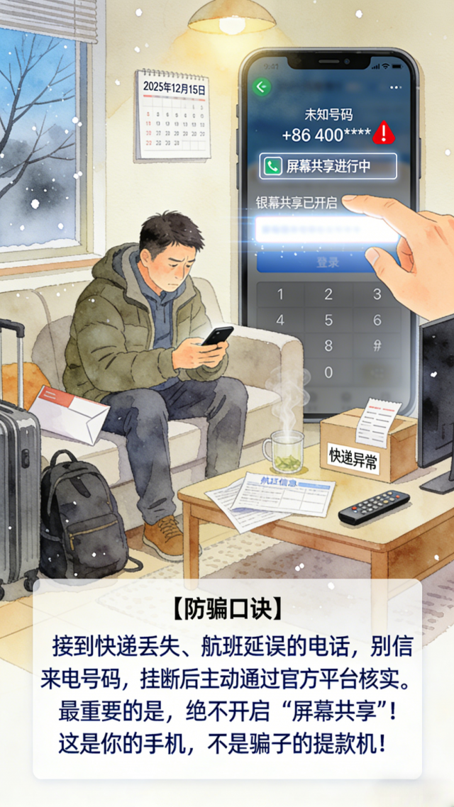 类似的多地发生“快递物流异常”诈骗。受害人收到短信称快递丢失,联系“客服”理赔。为了“验证身份”,被诱导开启屏幕共享,眼睁睁看着账户被洗劫。