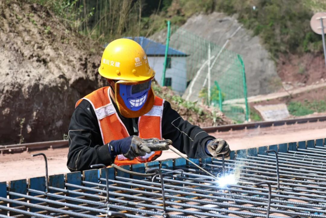 达州绕城高速公路西段施工现场,建设者正在焊接钢筋笼。